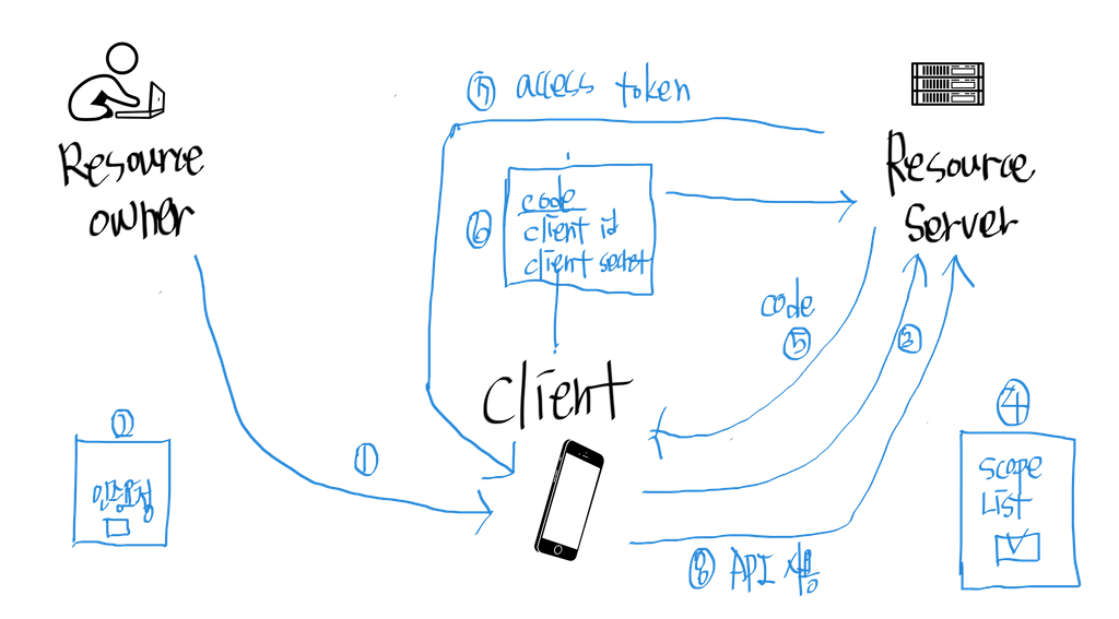 *auth code는 resource owner(나)가 위의 단계에서 정한 scope list의 정보를 사용하게 할 수 있는 일종의 비밀번호.