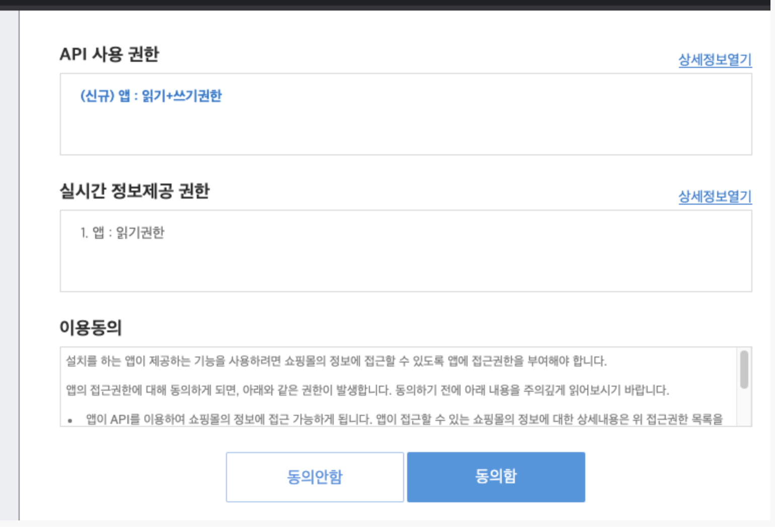 등록한 서비스 해줄 쇼핑몰의 아이디/비밀번호 입력창이 나오는데 알맞게 입력해주면 API 사용 권한 동의 창이 나온다.