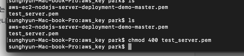 파일 권한 설정 소오오중한 pem파일 권한을 설정해준뒤,