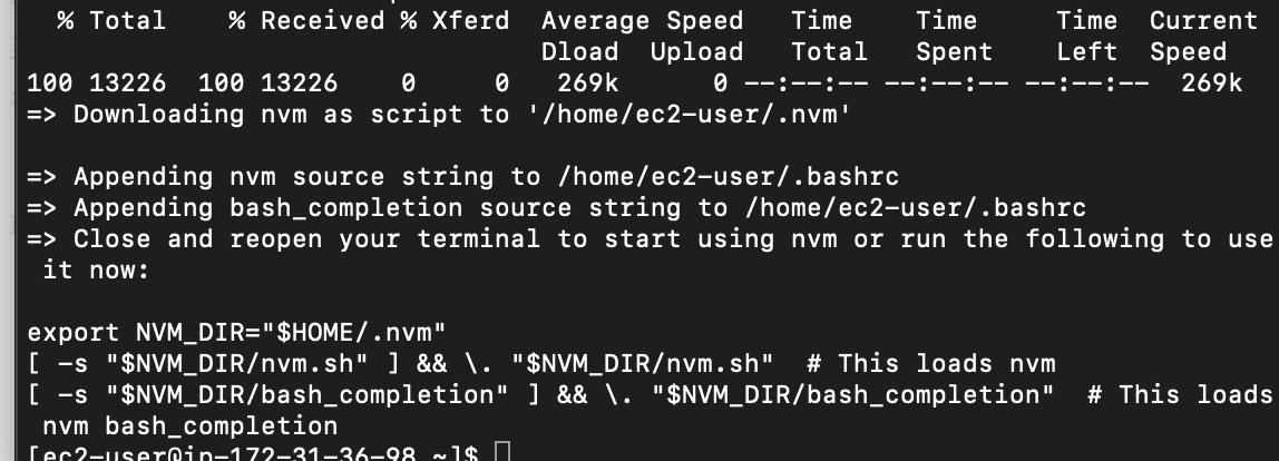 2. 연결된 EC2 상에서, 명령줄에 다음을 입력하여 nvm(노드 버전 관리자)을 설치합니다.